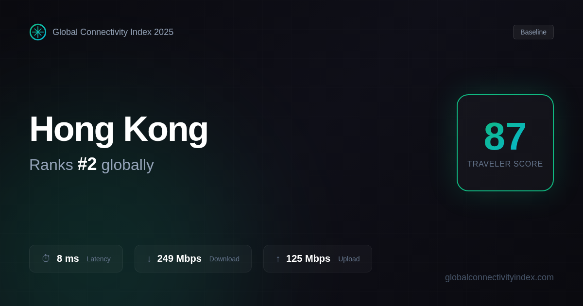 Global Connectivity Index (2025). Country: Hong Kong. Connectivity score: 87/100. Available at: https://globalconnectivityindex.com/share/c/hk