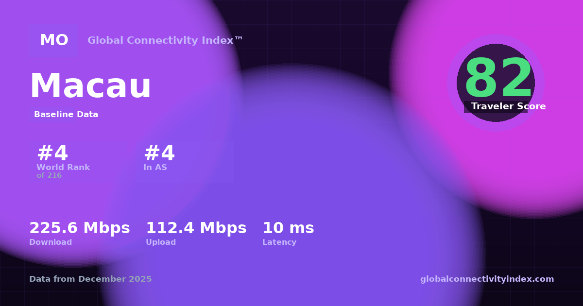 Global Connectivity Index (2025). Country: Macau. Connectivity score: 82/100. Available at: https://globalconnectivityindex.com/share/c/mo